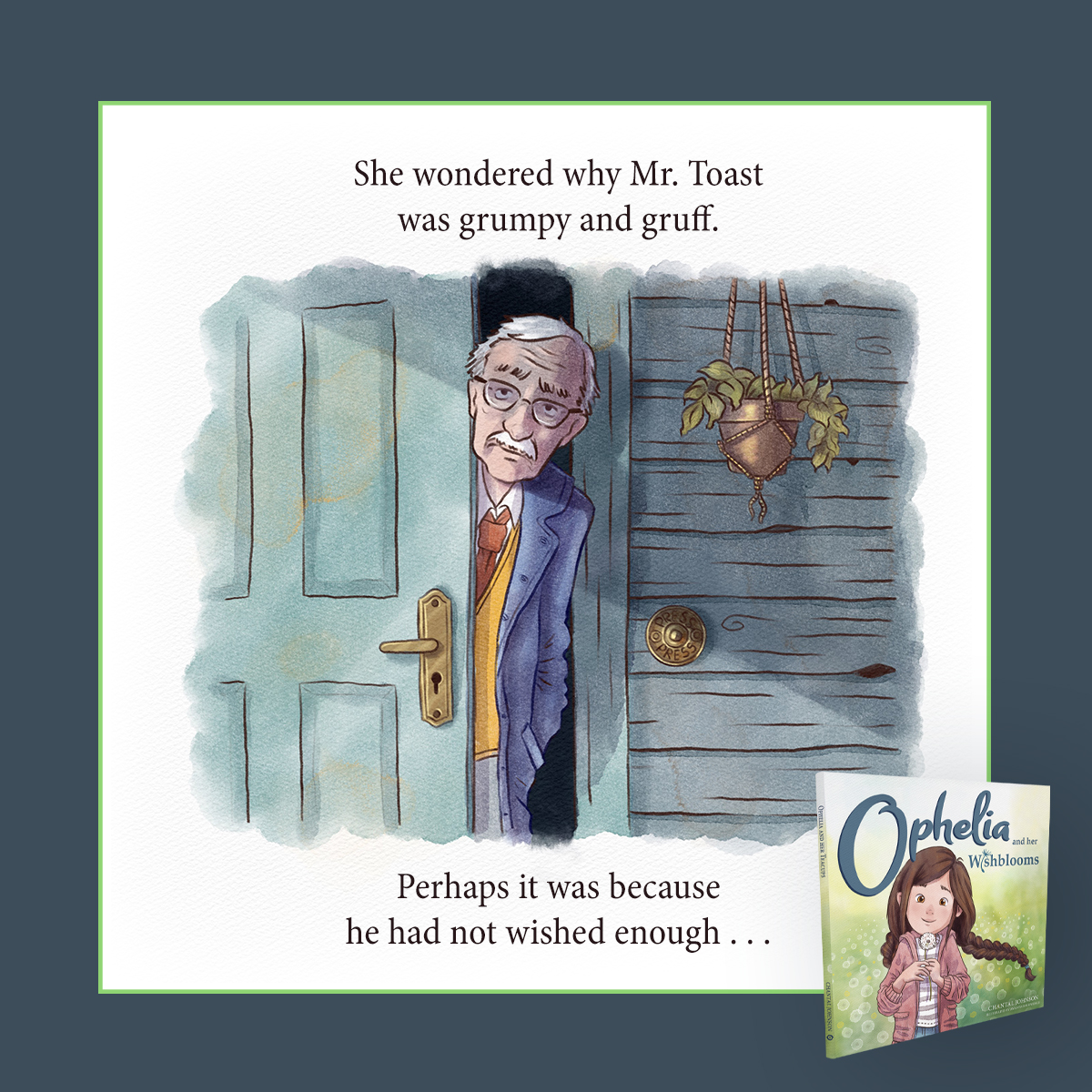 For Ophelia, spring in the hill country is the perfect time for wildflower wishes and time in the sun. One of her favorite things to do is make wishes and watch them come true. Every morning at a quarter of nine, she goes to the special patch of lush blooms near her neighbor’s front porch. Mr. Toast always comes out to see what this wishing is all about and always closes his door. He doesn’t make wishes anymore. Why does he not wish or even smile? Could it be that he has not made wishes in a while? How will Ophelia help him to start to make wishes right from his heart? Her name, Ophelia, means useful and wise. Surely, she will find a way to get inside.